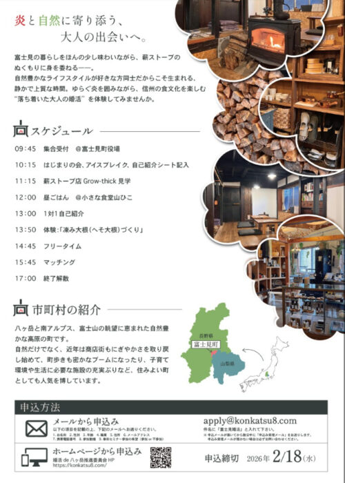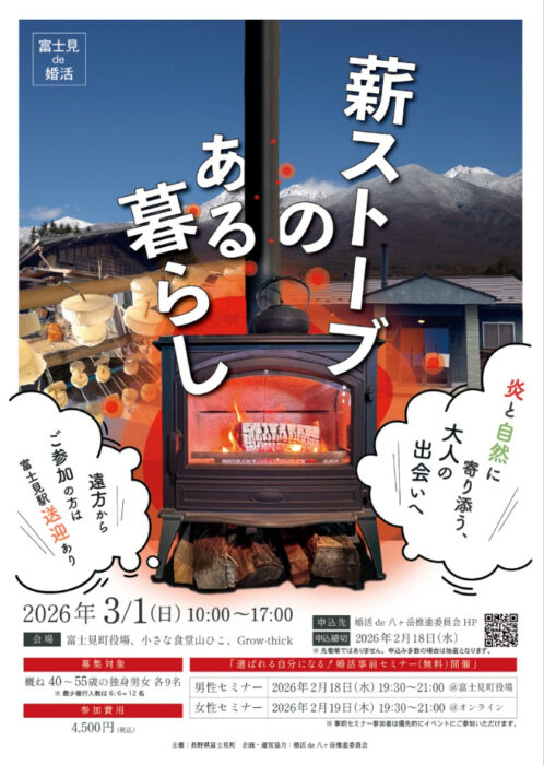 | イベント名 | 富士見de婚活 ~薪ストーブのある暮らし~ |