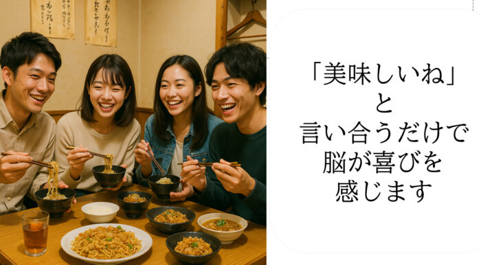 口を動かして返事をする、会話を楽しむ、食べる、飲む、噛む、歌う、笑う、深呼吸するなどなど。口を動かせば表情筋がほぐれて、貴方の表情も自然に豊かになっていきます。一日中笑顔でいられるようになるでしょう。上の写真のように、一日に一食は誰かと食事をしてください、会話が弾み笑顔もでるでしょう。雑談力も磨かれます。上の4名は「幸せオーラ」が笑顔から発信されていますね。彼ら自身も幸せを感じているはずです。